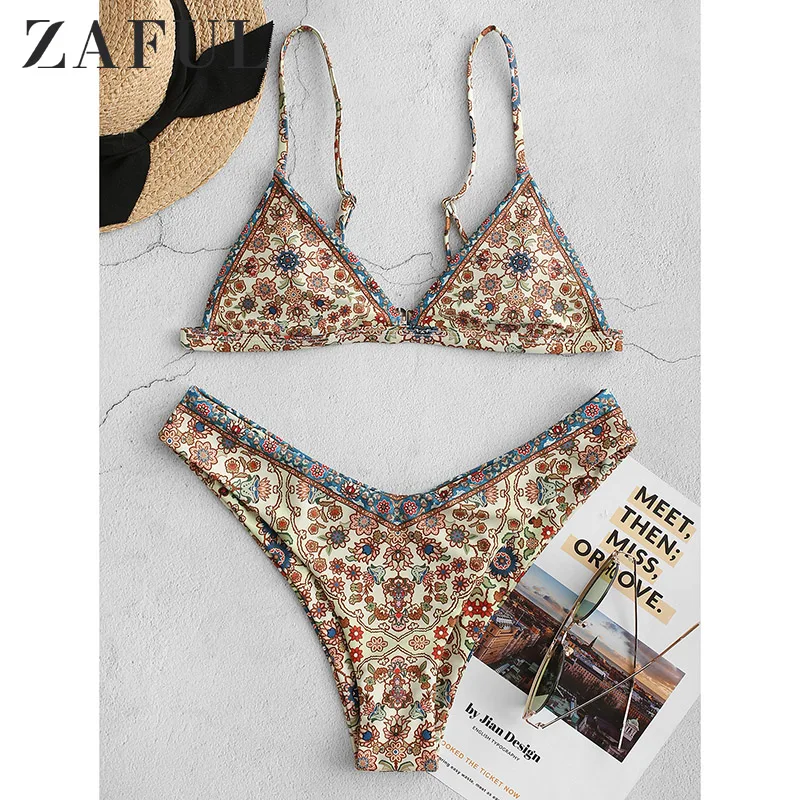 Limited Chance for ZAFUL Sexy Women Floral Print Padded Bra High Cut Beach Bikini Set Summer Boho Party Micro Swimwear